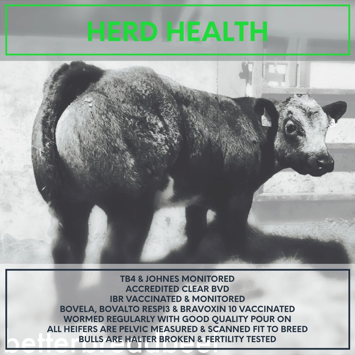 TB4, IBR marker vaccinated, BVD accredited vaccinated, Johnes screened, Bravoxin 10 system, Grazing outdoors, Electric fence trained, Halter trained, Semen tested, Ready to go!